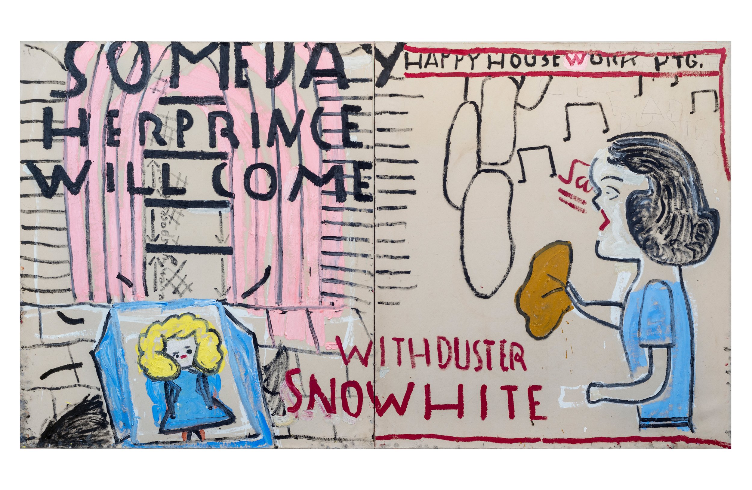 Snowwhite (3) with Duster, 2018, Oil on canvas, 183.5 × 320 cm, Private collection, © Rose Wylie. Courtesy the artist and David Zwirner. Photo: Jo Moon Price