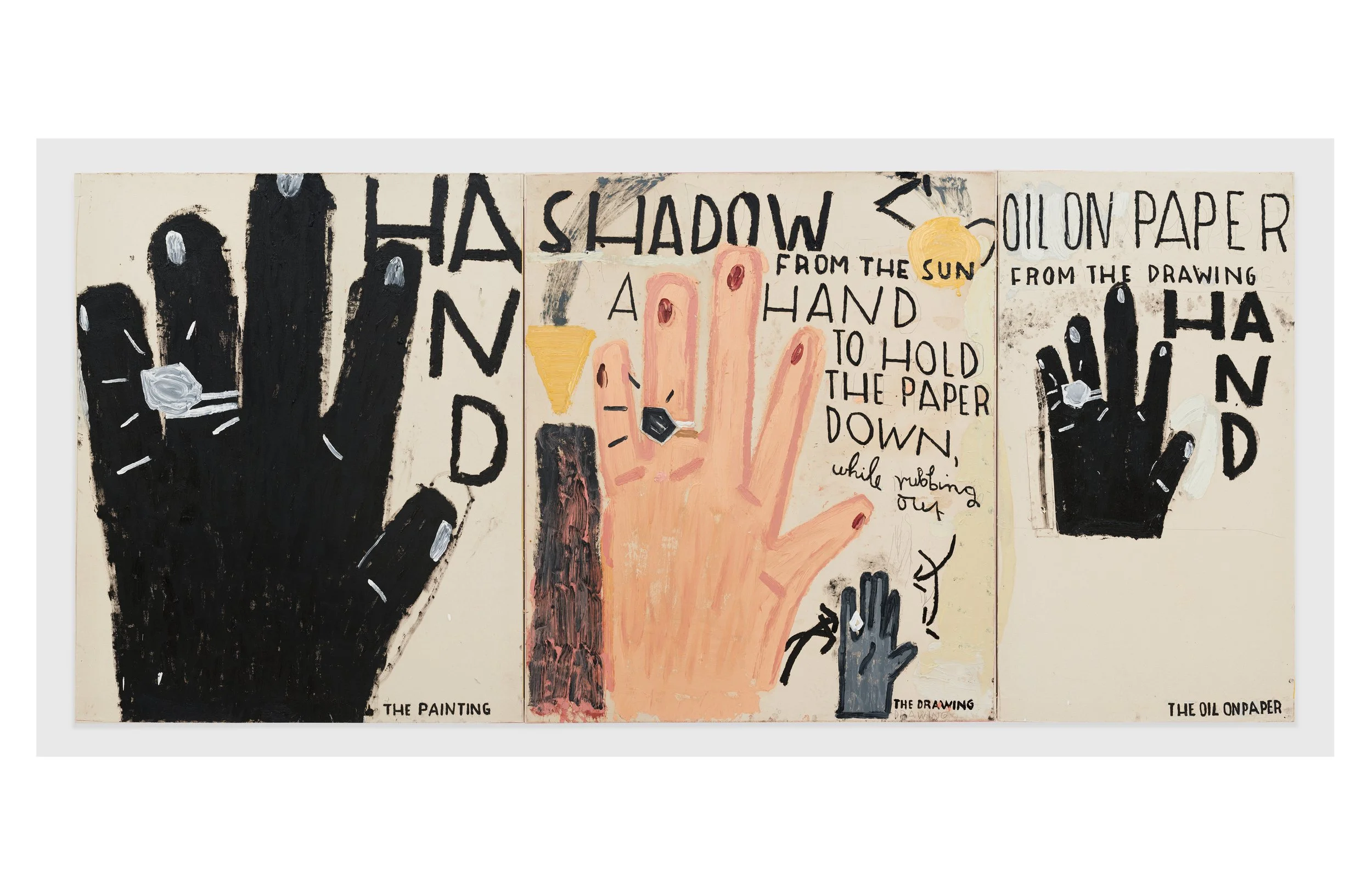HAND, Drawing as Central, 2022, Oil on canvas, 184 × 402 cm, Stedelijk Museum voor Actuele Kunst, Ghent, © Rose Wylie. Courtesy the artist and David Zwirner. Photo: Eva Herzog
