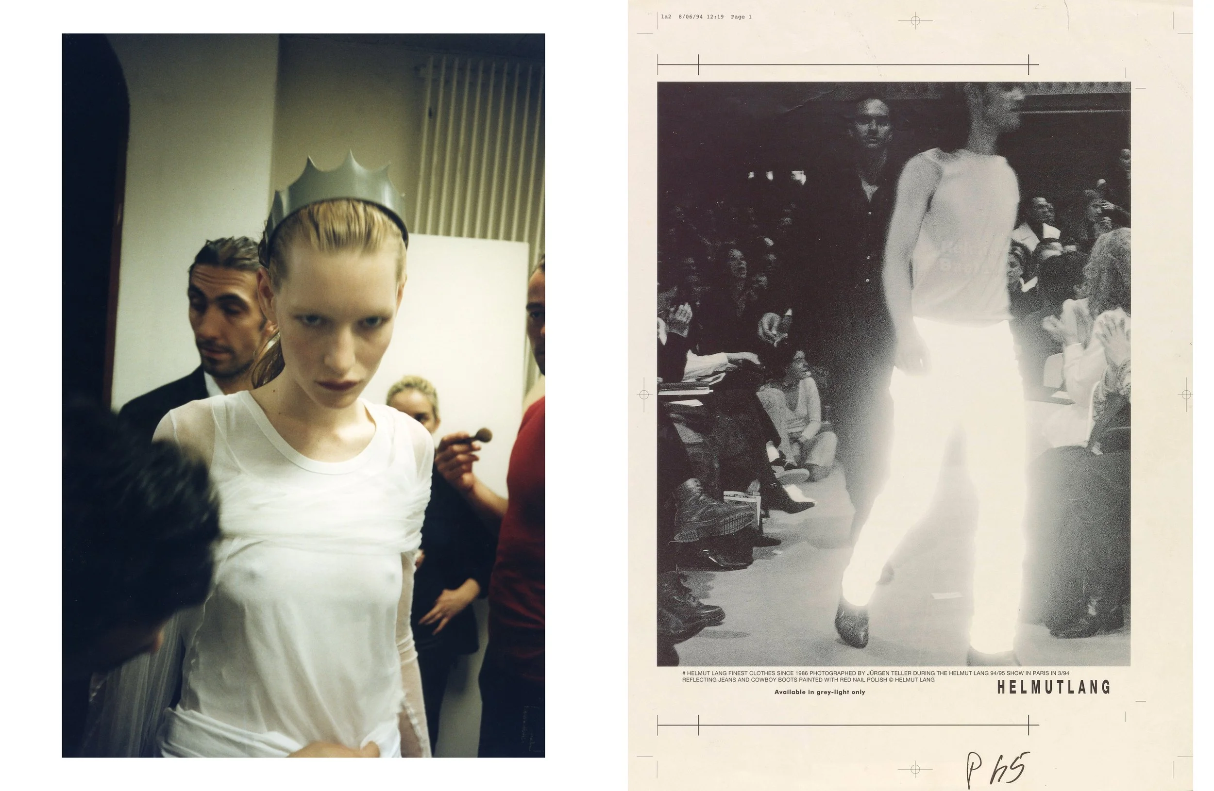 Left Helmut Lang, test print of an advertisement featuring “elastic holster tank and cotton knit cut-out glove,” Helmut Lang Collection Hommes Femmes Séance de Travail Défilé # Été 04, backstage photograph by Juergen Teller, MAK Helmut Lang Archive, LNI 1778-4-54. Courtesy of hl-art